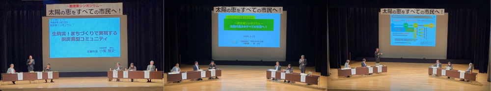 - 2月23日(祝)13:30~たけまるホールにて脱炭素シンポジウム「太陽の恵を すべての市民へ!」を開催しました。